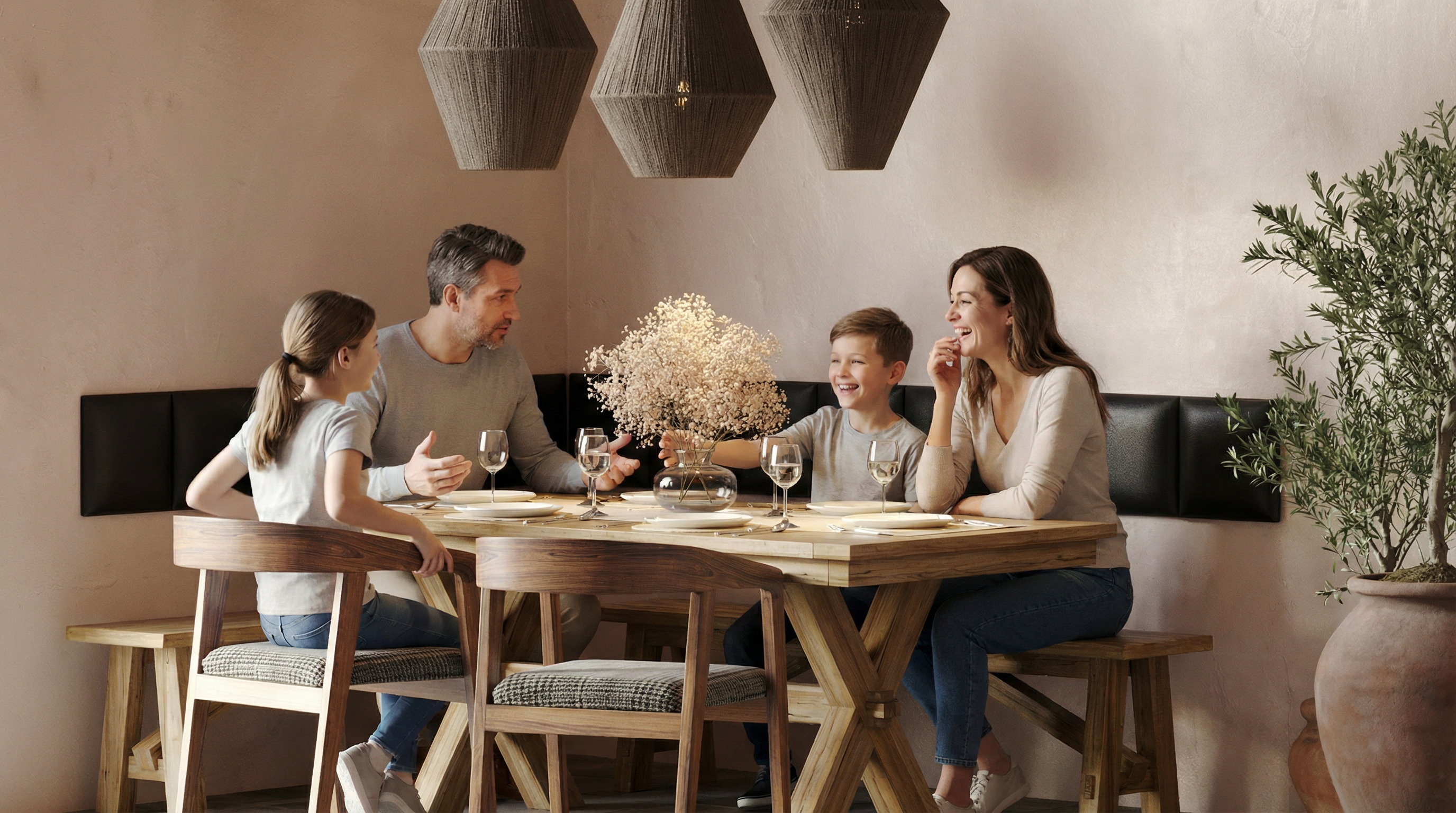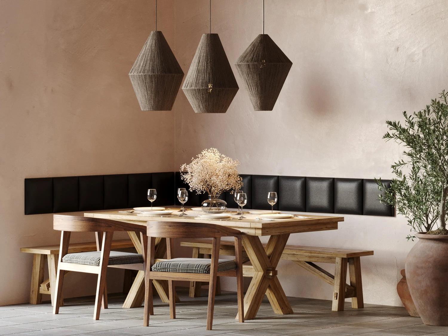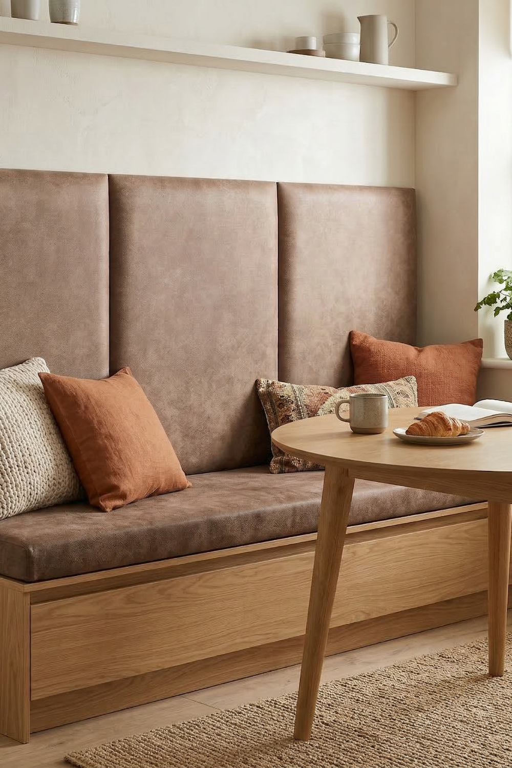 weiche Wandverkleidung hinter dem Sofa. - Im Essbereich: Als gepolsterte Sitzecke, die Komfort und Stil vereint.