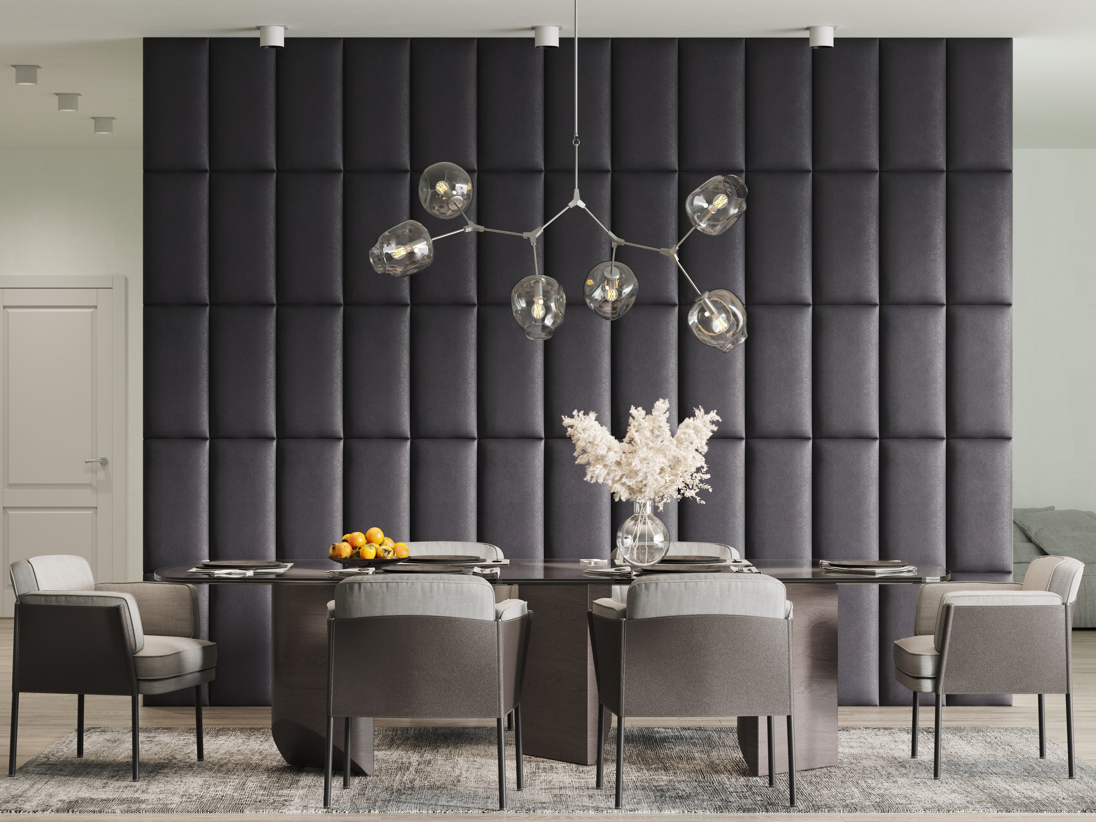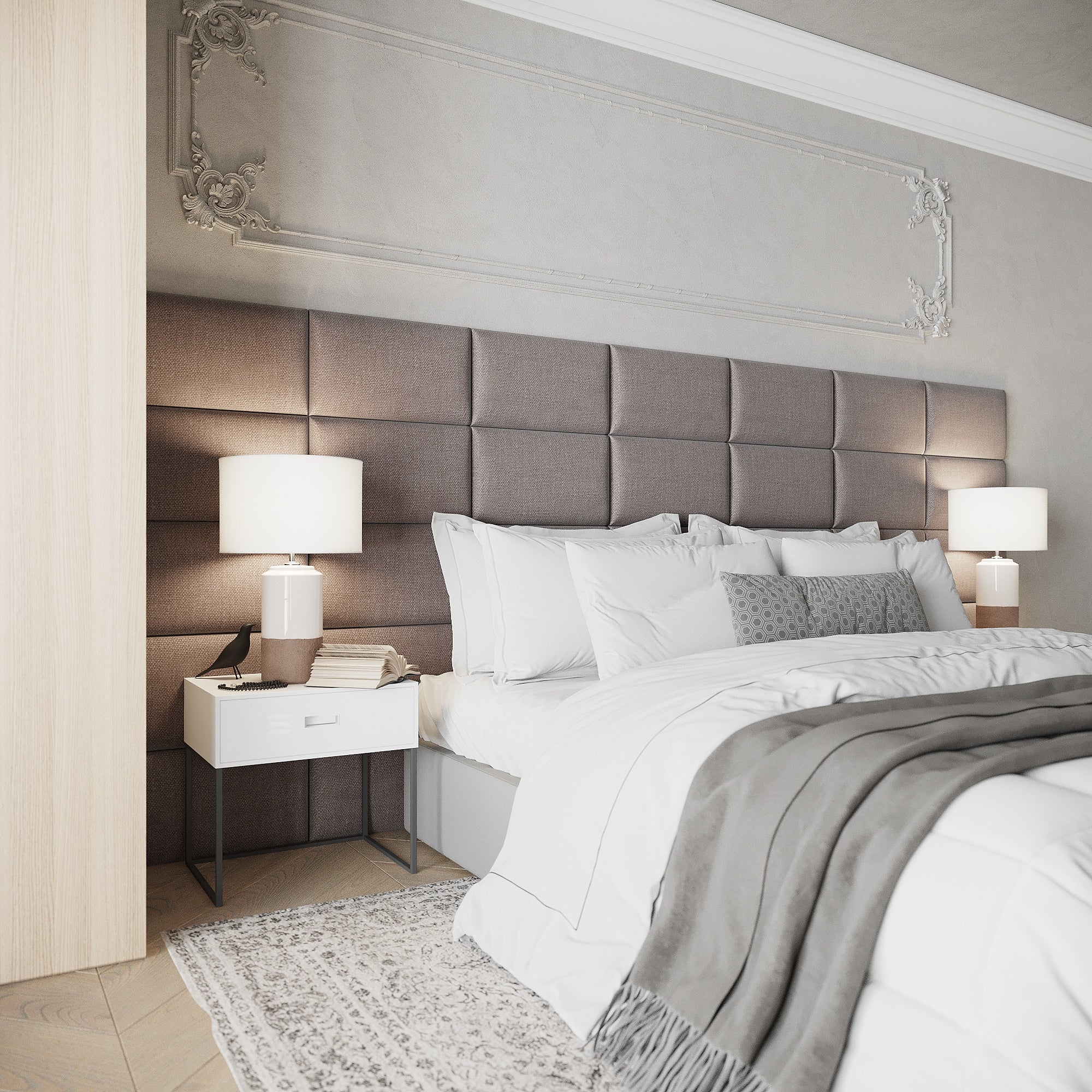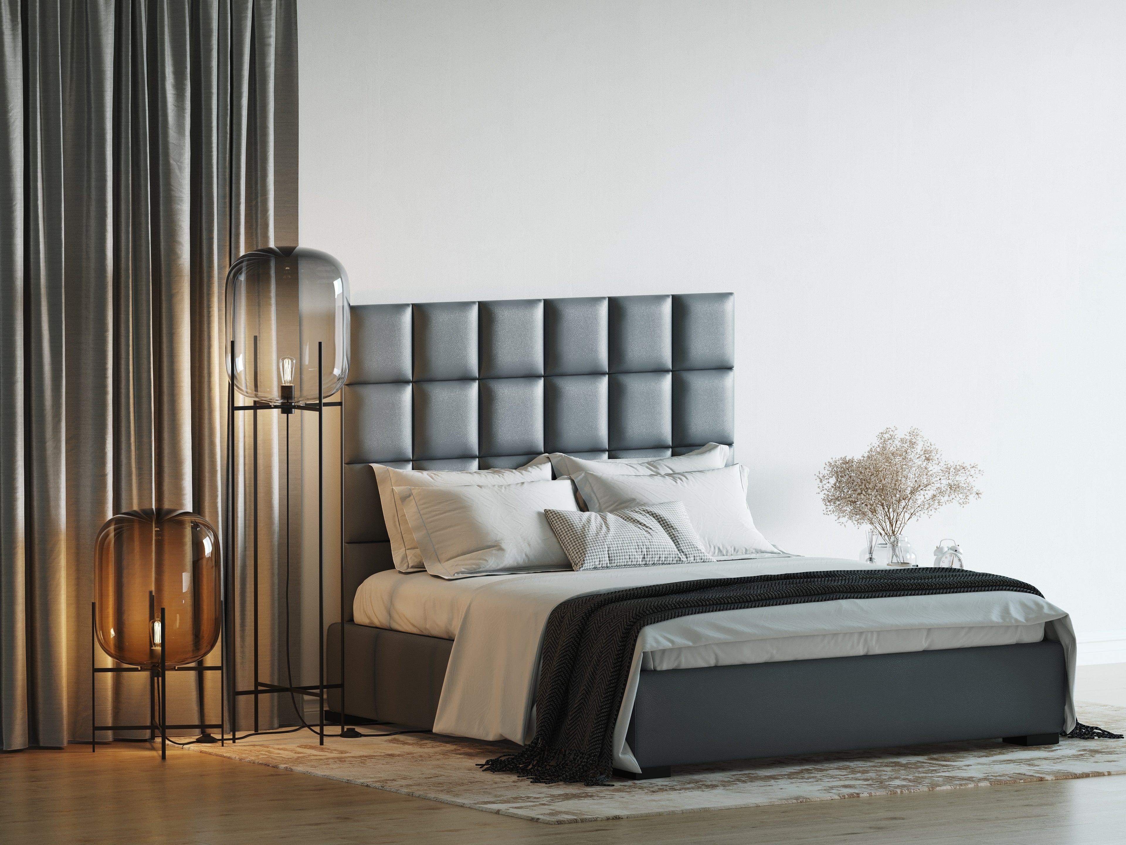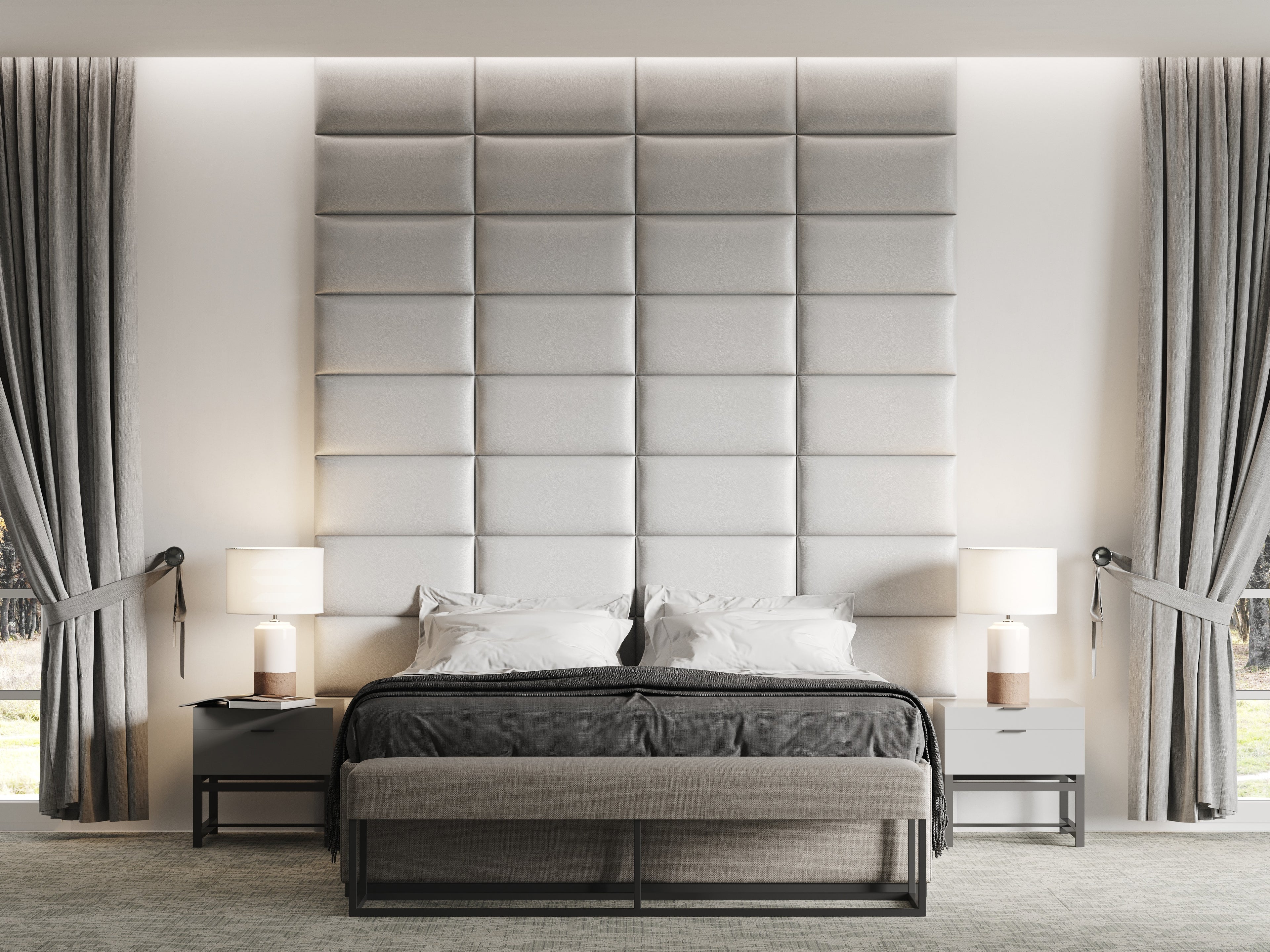 Graue Polsterpaneele als luxuriöses Kopfteil im modernen Schlafzimmer und hochwertige Wandpaneele aus Samt für stilvolle Raumgestaltung.